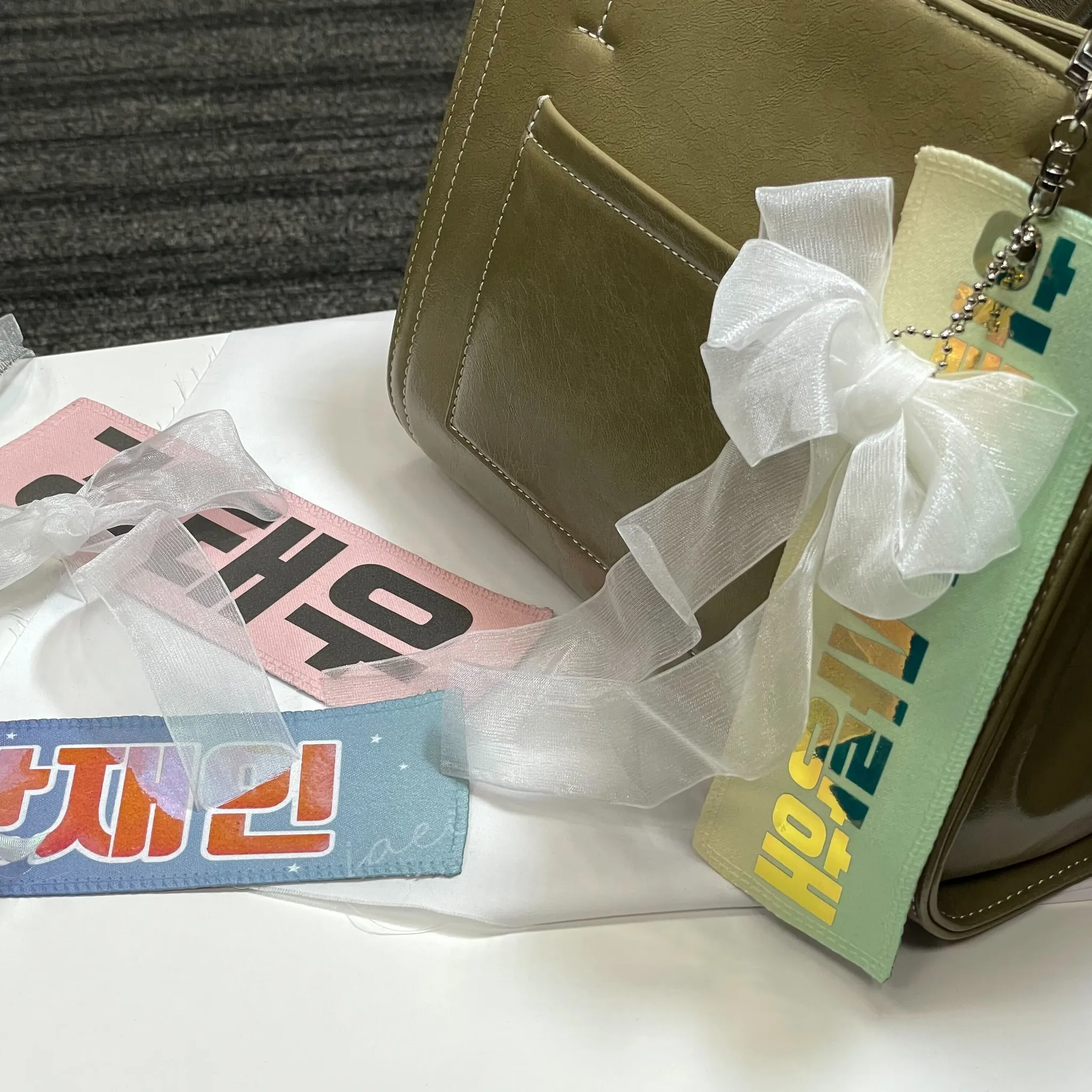 ミニスローガンに穴をあけて、キーチェーンを通すとあっという間にスローガンキーホルダーが完成!リボンやアクキーを一緒につけたらもっと可愛くなります♡